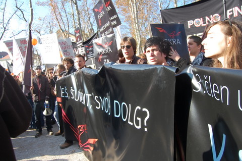 ZA SOLIDARNO SLOVENIJO; ZA SOCIALNO EVROPO; VARČEVANJE NE DELUJE; KRIZA JE /…/; VLADA OTROKE STE LAČNE PUSTILI, DELAVCE BOSTE NA CESTO PAHNILI, SAMI PA BLAGAJNE SPRAZNILI; ZA DOSTOPEN ŠTUDIJ; ZA KVALITETNO UNIVERZO; PROTI NOVELI ZVIS; NE ZMANJŠUJTE PLAČ IN POKOJNIN, ODPIRAJTE NOVA DELOVNA MESTA; HOČETE HLAPCE, DOBITE VSTAJO!
